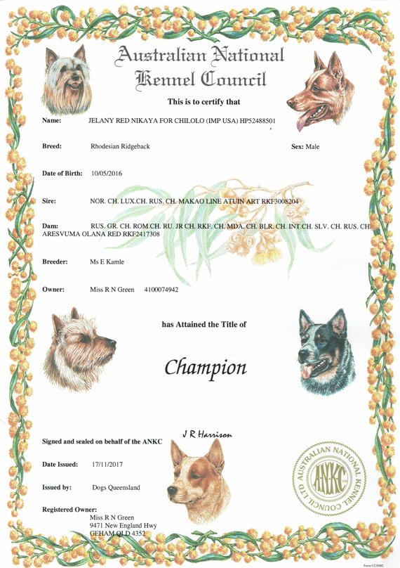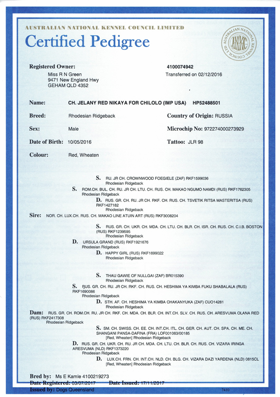 Pedigree name: Aust Ch Jelany Red Nikaya For Chilolo (Imp Russia)
